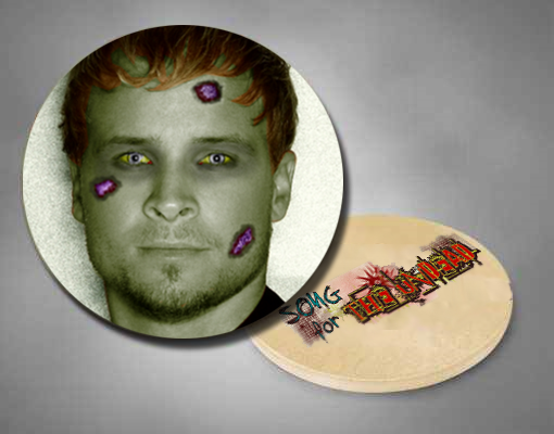 Entertain (or frighten) your house guests with this sexy, scary Zombie Brian coaster, featuring the Song for the Undead logo on the back. Don't worry, this undead Backstreet Boy won't eat your BRAAAINSSS, but he will keep the rings off your coffee table!